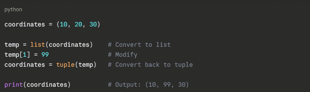 Sometimes you need to modify a tuple temporarily. You can convert it to a list, make changes, then convert it back.