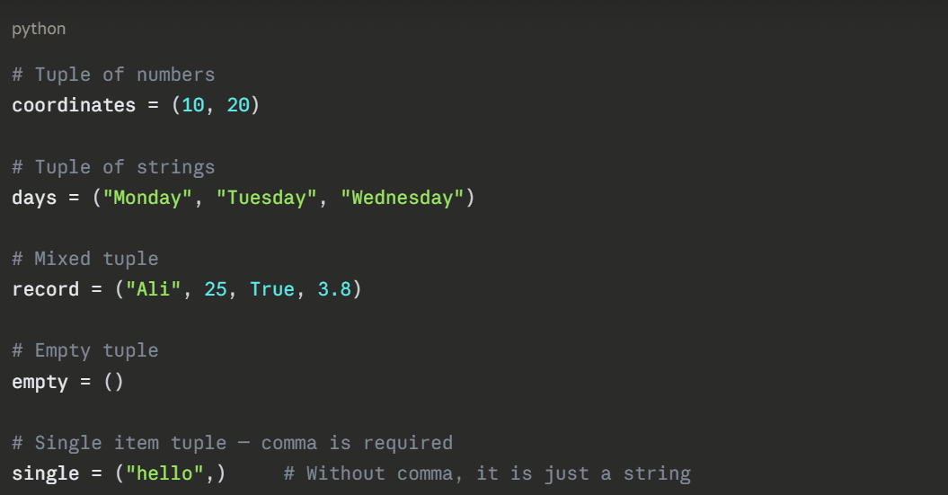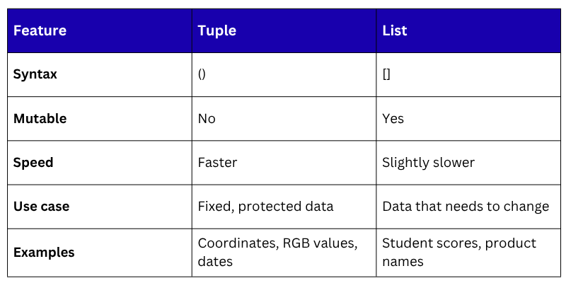 Not all data is meant to be changed. When you have a collection of values that should remain fixed throughout a program — such as coordinates, dates, or configuration settings, a tuple is the right choice.