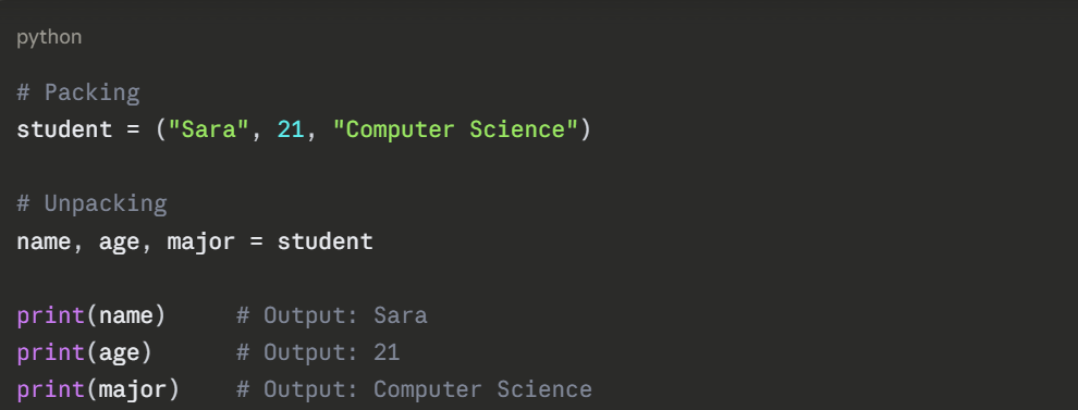 Packing means storing multiple values into a tuple. Unpacking means extracting those values into individual variables — a very clean and readable Python feature.