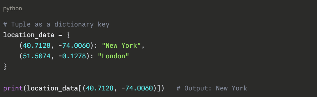 3. Dictionary keys — tuples can be used as keys; lists cannot.