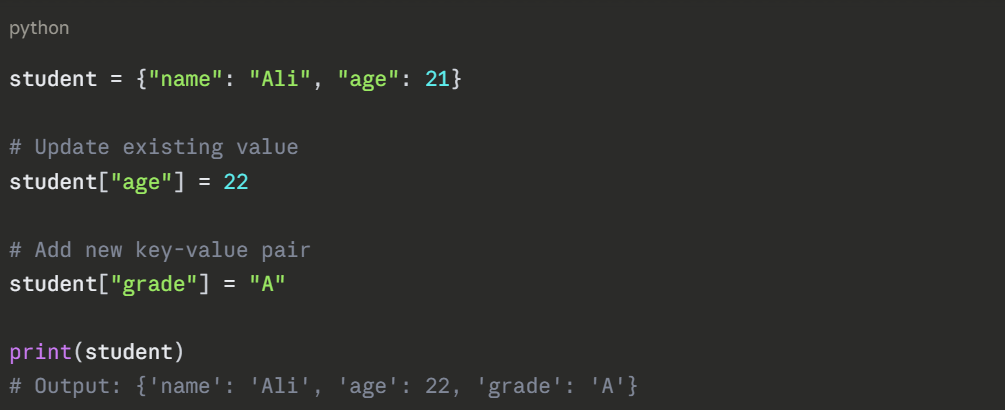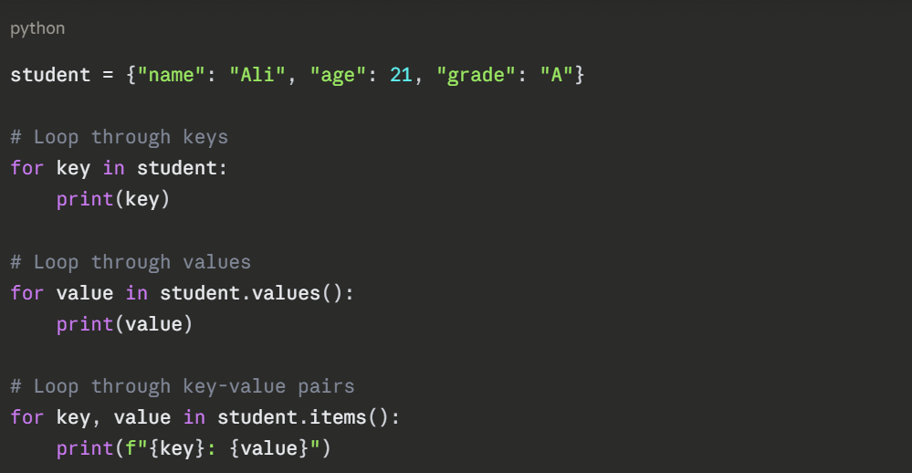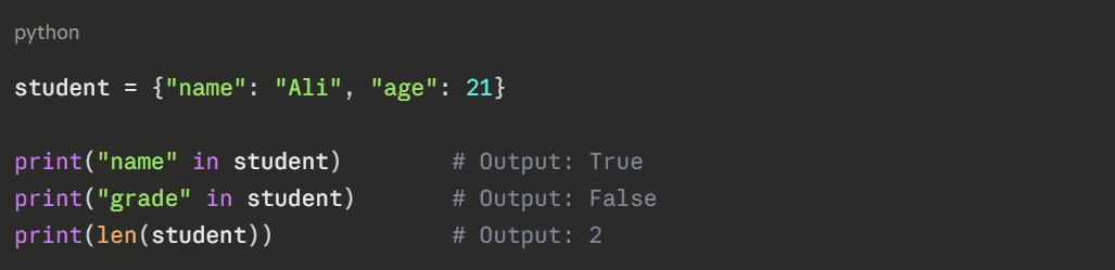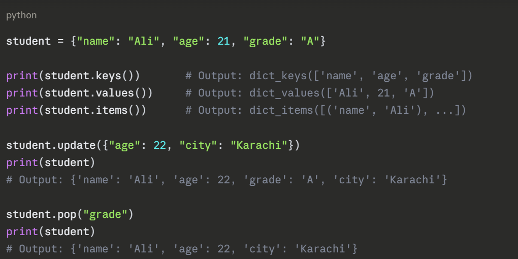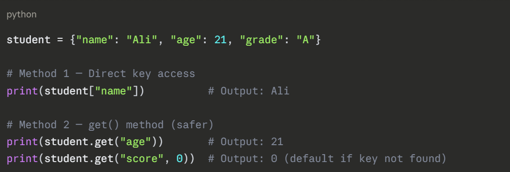Tip: Use .get() when you are not sure if the key exists, it avoids a KeyError by returning None or a default value instead.