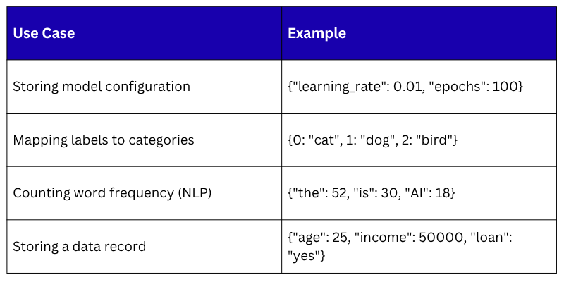 They are widely used in AI for handling datasets, model configurations, storing labels, and managing structured records.