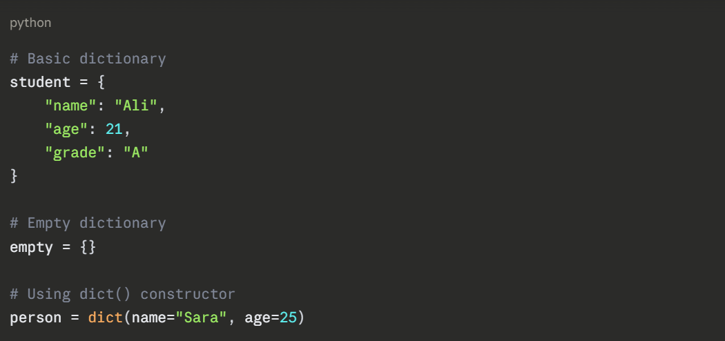 Dictionaries are defined using curly braces {}, with each entry written as key: value, separated by commas.