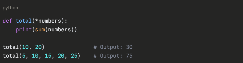 When you do not know how many arguments will be passed, use *args. It collects all positional arguments into a tuple.
