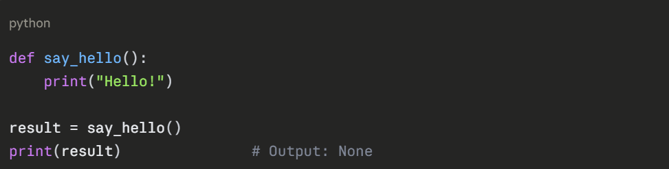 The return statement sends a result from the function back to wherever it was called. Without return, a function performs an action but gives nothing back, it returns None by default.