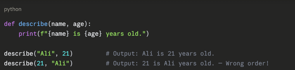 Order matters with positional parameters, always pass arguments in the correct sequence.