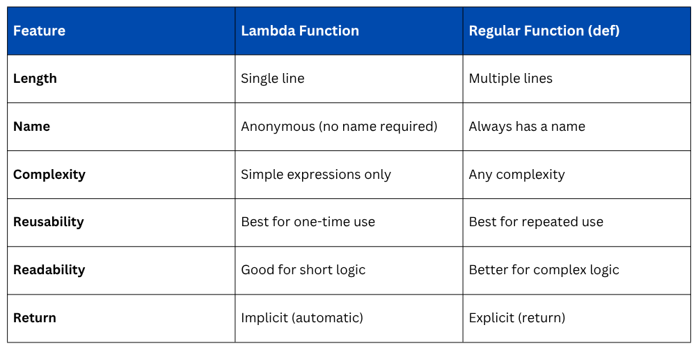 Keep in mind — if the logic becomes more complex than a single expression, a regular function is the better choice.