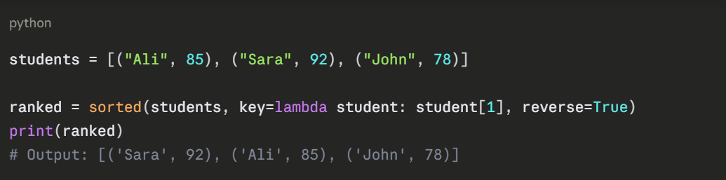 Here, lambda student: student[1] tells sorted() to rank by the score (second element of each tuple).