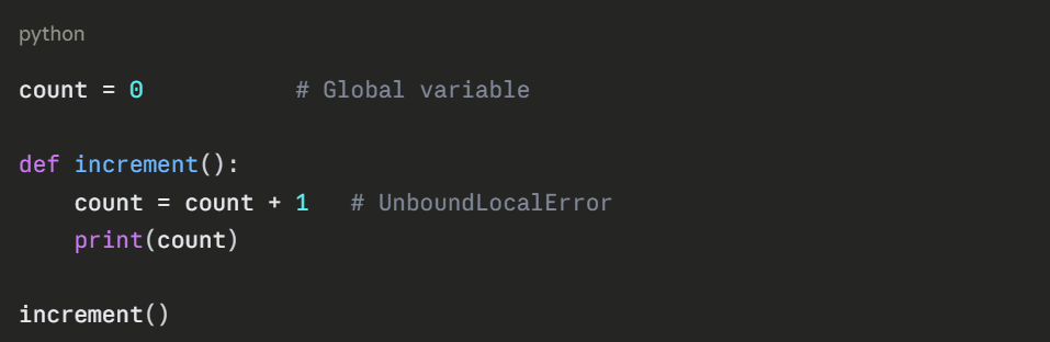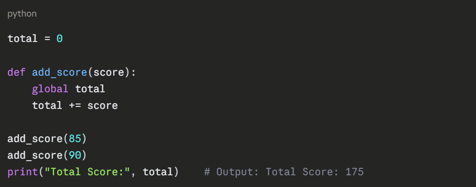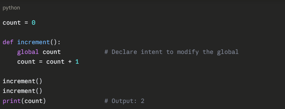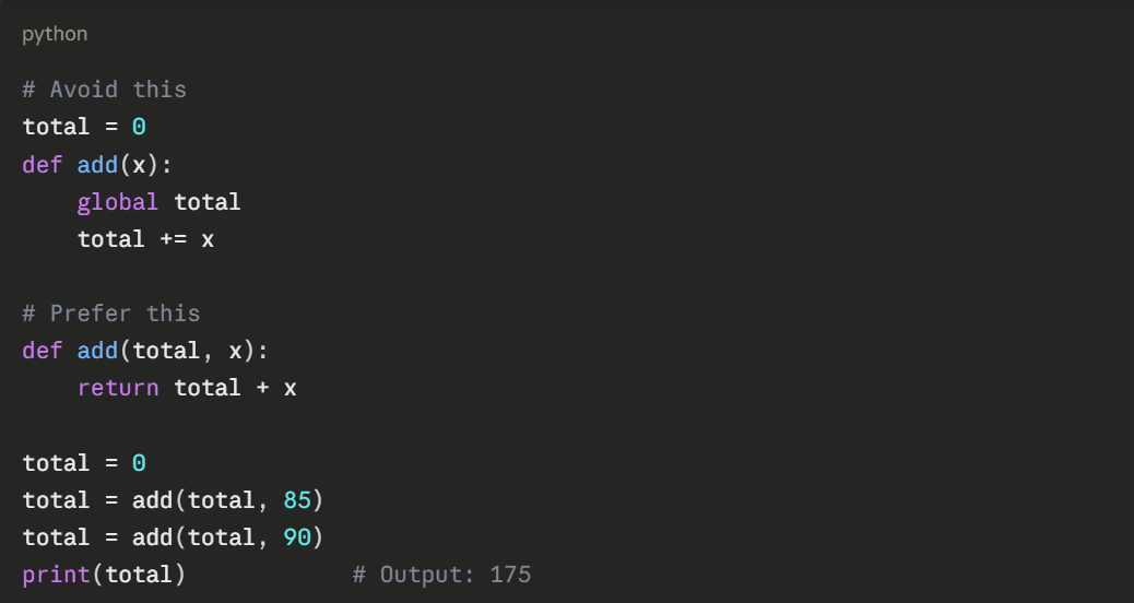 Best Practice: Use global sparingly. Overusing it makes code harder to debug and maintain. A better approach is to pass values as parameters and return results.