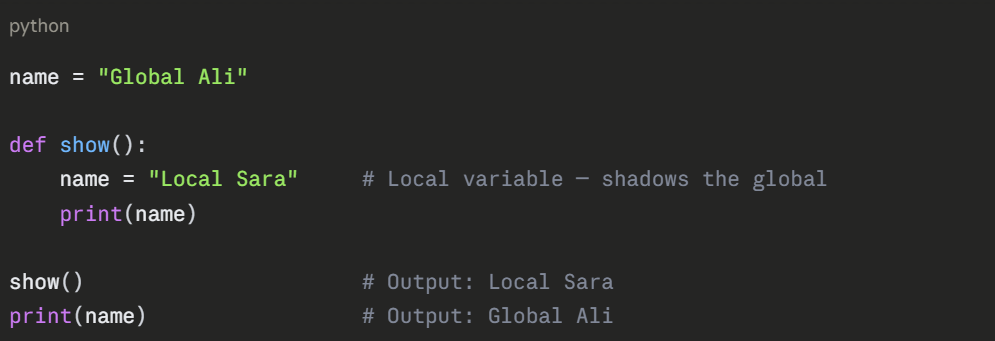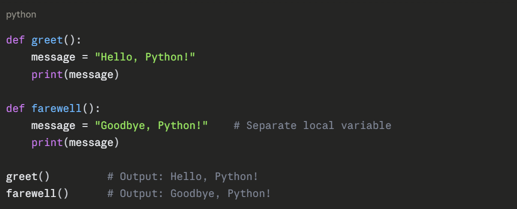 Local VariablesA local variable is created inside a function and exists only within that function. Once the function finishes executing, the variable is gone.