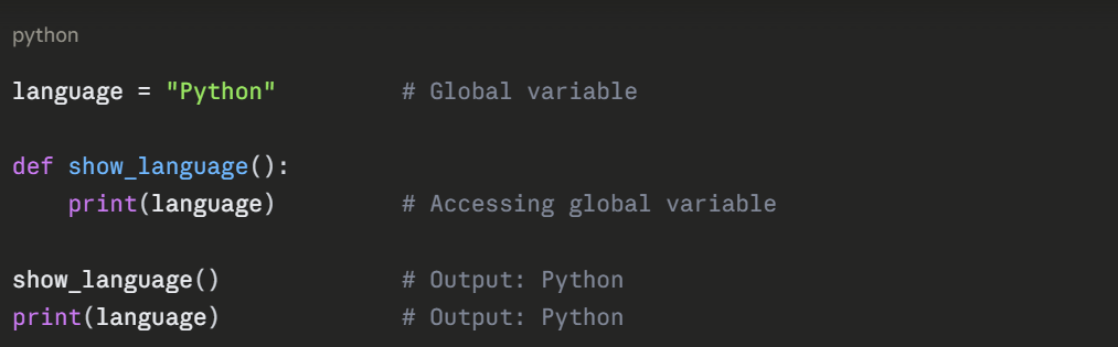 A global variable is defined outside all functions and can be read from anywhere in the program, including inside functions.
