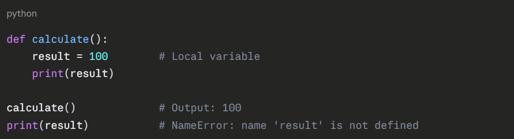 result only exists inside calculate(). Trying to access it outside causes an error.