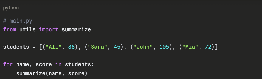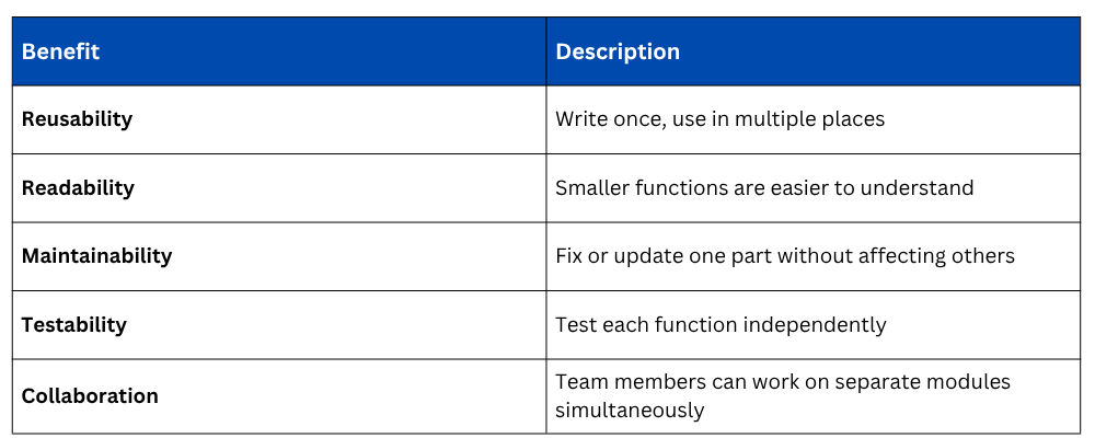 As your programs grow in size and complexity, keeping all your code in one long file becomes difficult to manage, read, and debug. Modular code is the solution — it means breaking your program into smaller, self-contained, and reusable pieces.