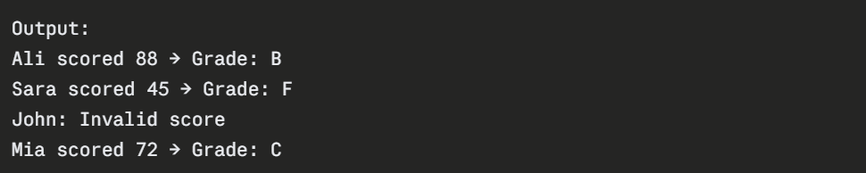 print(f"{name} scored {score} → Grade: {grade}")