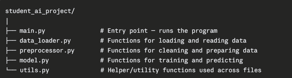 For larger programs, organize related modules into a folder structure. Here is a typical modular layout for a small AI project: