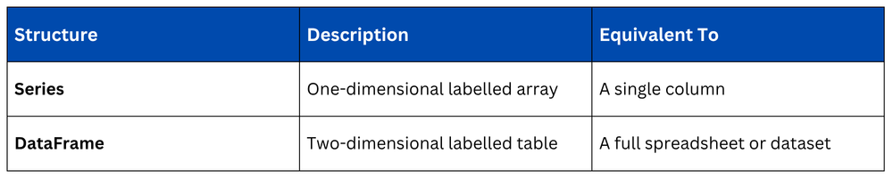 A DataFrame is the primary structure you will work with. It consists of rows and columns, similar to an Excel spreadsheet.