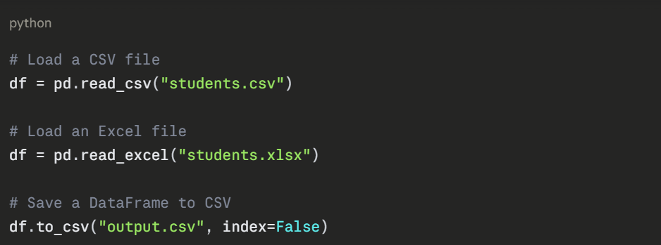 In practice, data comes from external files. Pandas makes loading data straightforward.