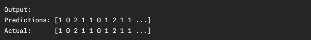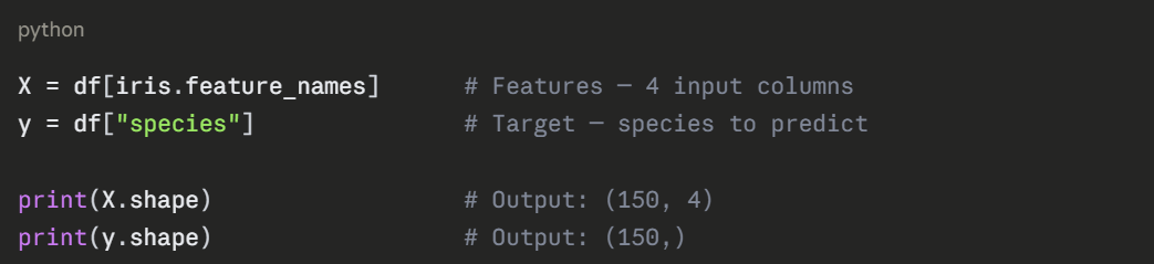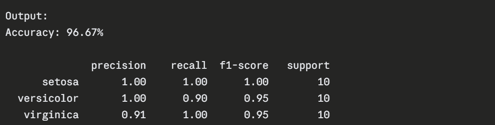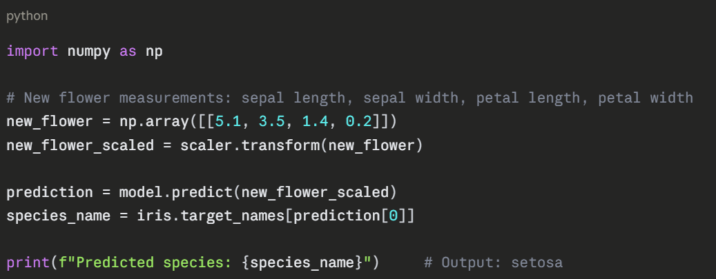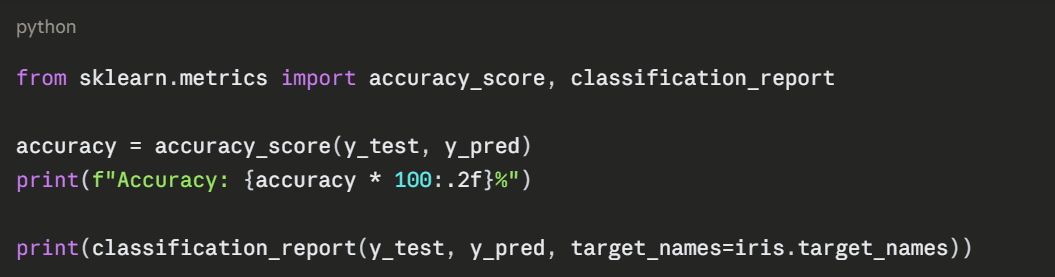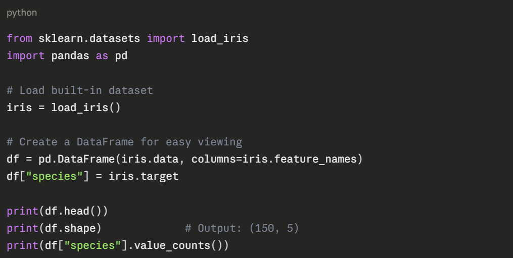 The following example uses the built-in Iris dataset — a classic beginner dataset containing measurements of three species of flowers. The goal is to classify which species a flower belongs to based on its measurements.