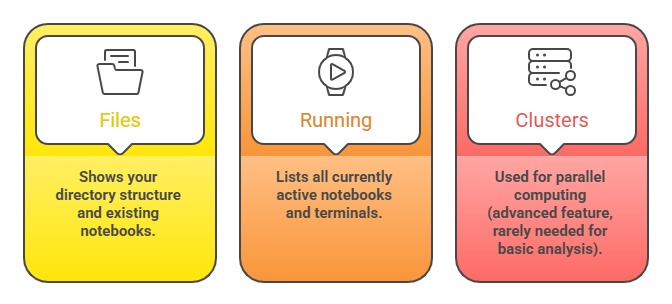 When you first launch Jupyter Notebook, you land on the dashboard—your control center for managing notebooks and files.