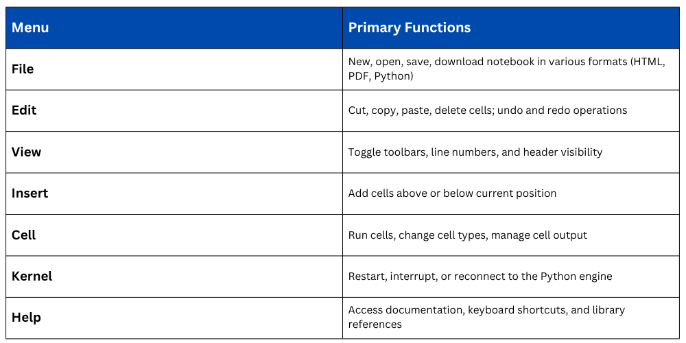 If code runs longer than expected or enters an infinite loop, click the stop button or use Kernel → Interrupt. This stops execution without losing your variables.