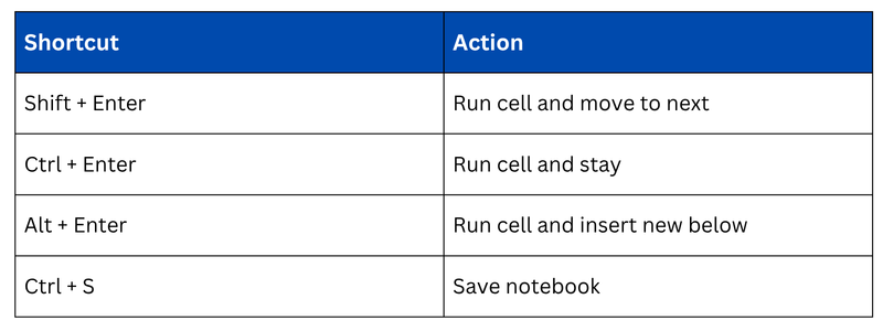 1. Run current cell: Press Shift + Enter (moves to next cell)