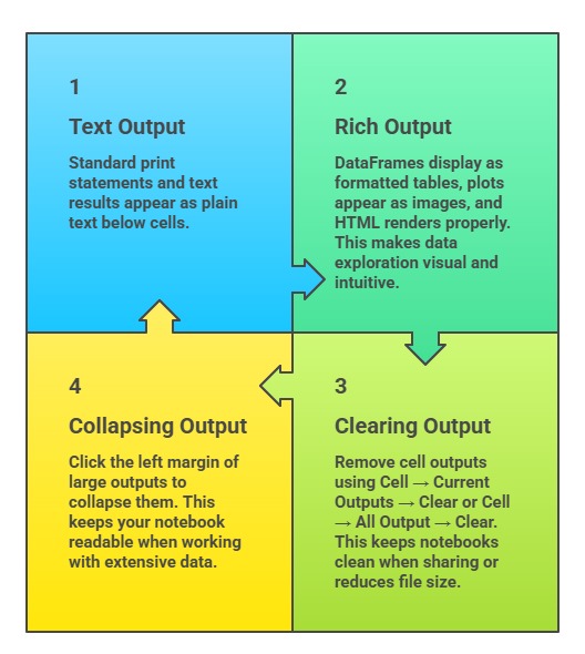 Code cells contain Python code that gets executed when you run them. After execution, outputs appear directly below the cell, including: