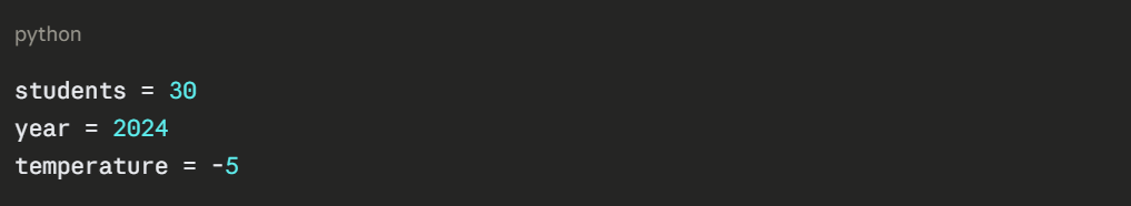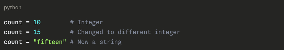 Notice that you don't need to declare the variable type beforehand. Python automatically determines what kind of data you're storing based on the value you assign. This feature, called dynamic typing, makes Python code cleaner and more intuitive.