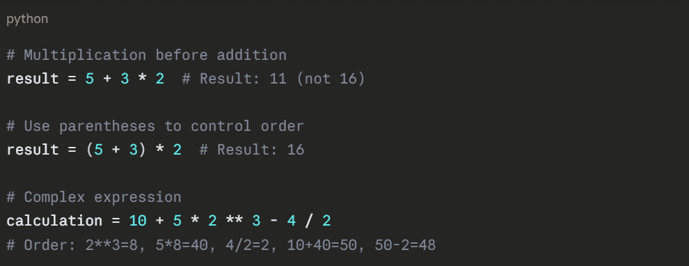 When multiple operators appear in an expression, Python follows precedence rules (similar to mathematical order of operations):