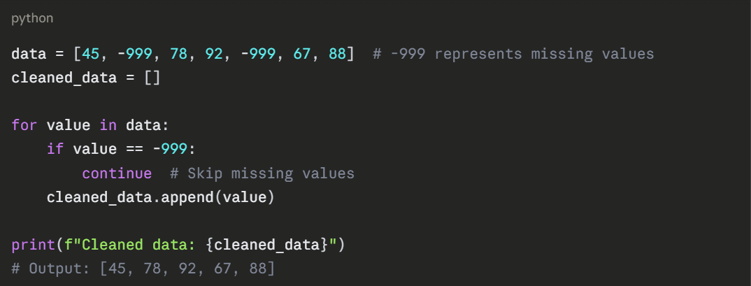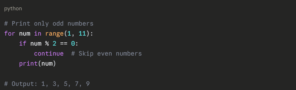 The continue statement skips the remaining code in the current iteration and moves to the next one: