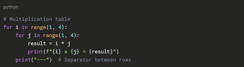 Performance Consideration: Nested loops multiply execution time. A loop running 100 times containing another loop running 100 times executes 10,000 times total. Use caution with large datasets.