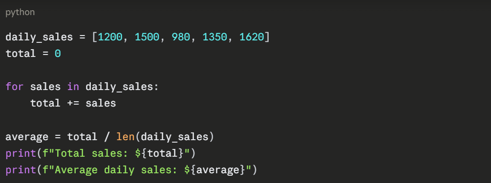 sales = [1200, 1500, 800, 2000, 1100, 1800, 950]