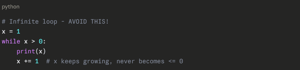 Critical Warning: Always ensure the condition eventually becomes false, or you'll create an infinite loop:
