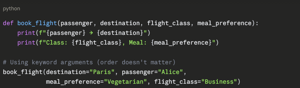 Important: Default parameters must come after non-default parameters in the function definition.