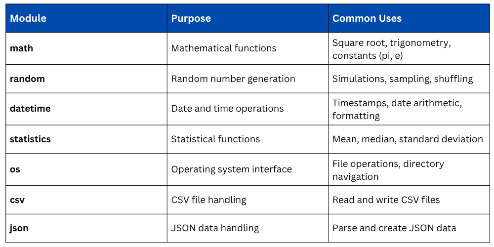 These organizational tools are essential for writing clean, maintainable code and leveraging Python's vast ecosystem of pre-built functionality.