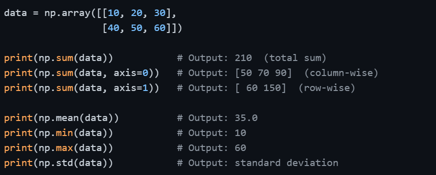 NumPy provides a clean set of functions to compute summary statistics across an array or along a specific axis.