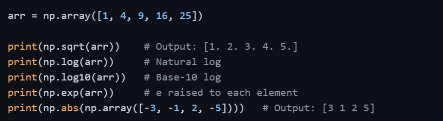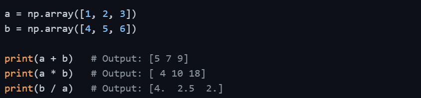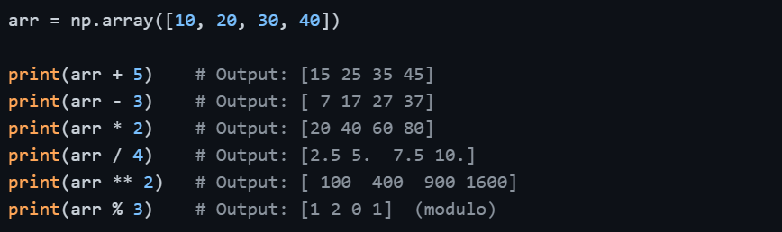Once arrays are created, NumPy allows you to perform a wide variety of operations on them — all vectorized, meaning they apply to every element simultaneously without needing a loop.