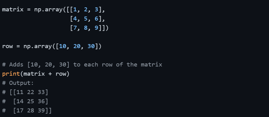In this example, the 1D array row is automatically "broadcast" across all three rows of the matrix. Broadcasting eliminates the need for manual loops and makes code significantly more concise and efficient.