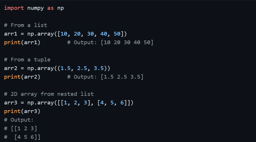 The most straightforward way to create a NumPy array is by converting an existing Python list or tuple using np.array().