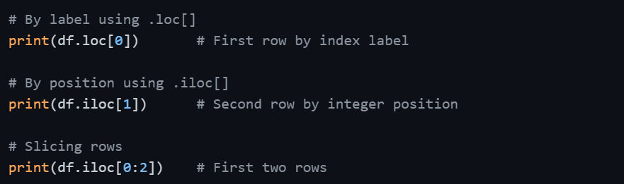 .loc[] uses label-based access and .iloc[] uses position-based access. This distinction becomes especially important when working with custom or non-numeric indexes.