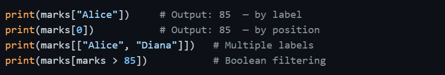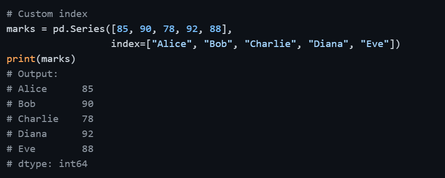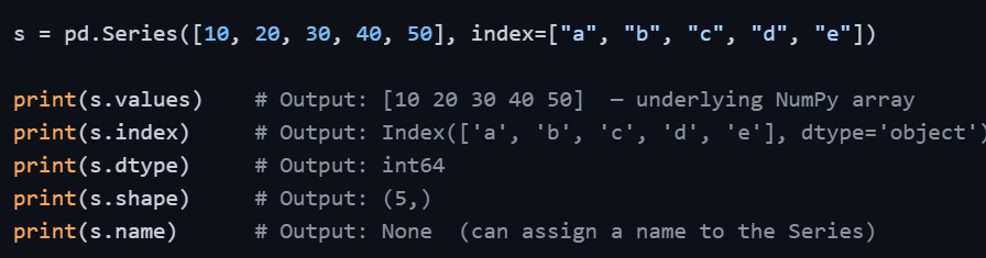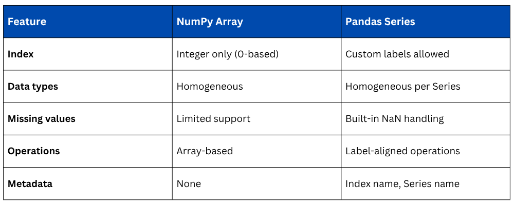 The most important advantage of a Series over a plain NumPy array is label alignment — when you perform operations between two Series, Pandas aligns them by their index labels automatically, not just by position.