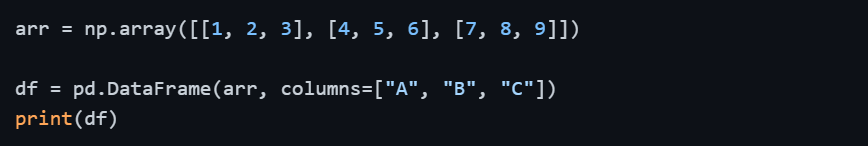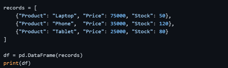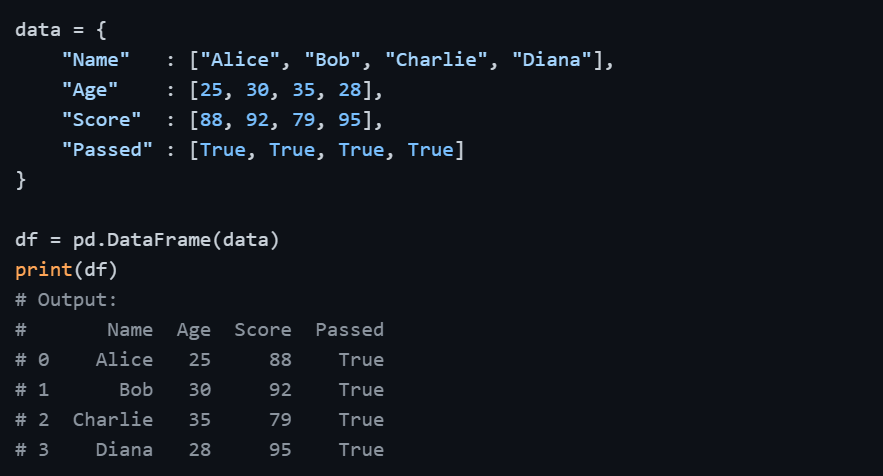 The most common way to create a DataFrame is by passing a dictionary where each key becomes a column name and each value (a list) becomes the column data.