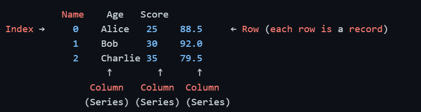 A Pandas DataFrame is a two-dimensional, tabular data structure with labeled rows and columns, essentially a spreadsheet or SQL table in Python. Each column in a DataFrame is a Series, and all columns share the same row index.