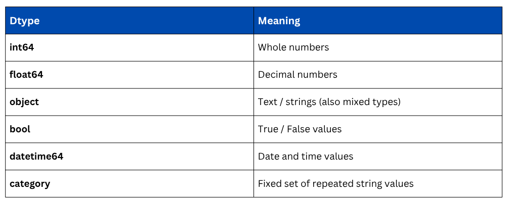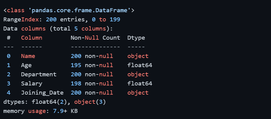 1. Non-Null Count: If a column shows 195 non-null out of 200 rows, that means 5 missing values exist in that column. This is the fastest way to detect missing data.