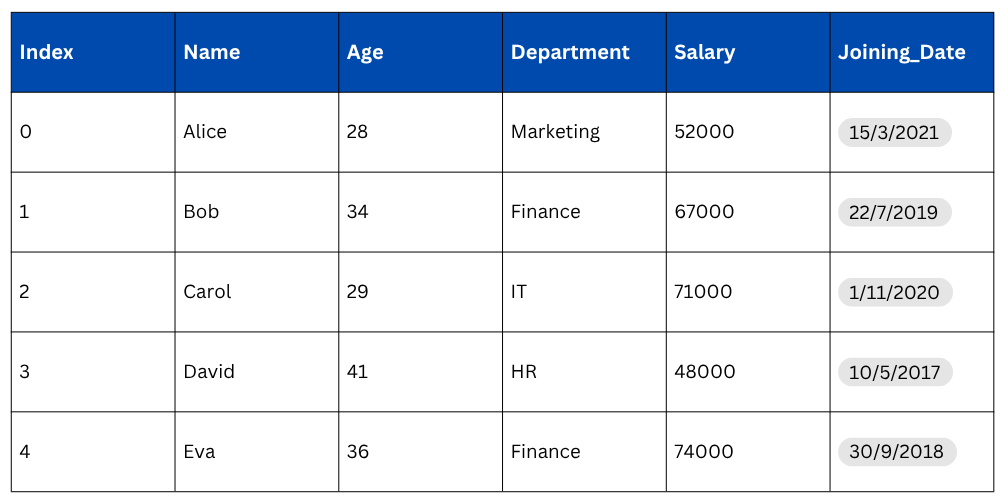 2. Dtype (Data Type): Check whether Pandas has correctly identified each column's type. For example, Joining_Date is showing as object (string) instead of datetime — this tells you a type conversion is needed before date-based analysis.