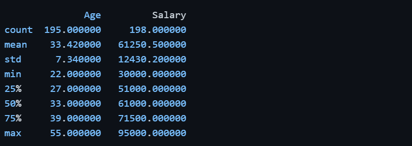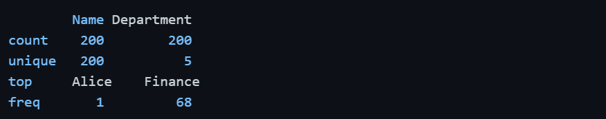 Here, unique shows the number of distinct values, top shows the most frequent value, and freq shows how many times it appears.