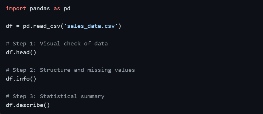 Pandas provides three essential methods — .head(), .info(), and .describe() that together give you a complete first look at your data.
