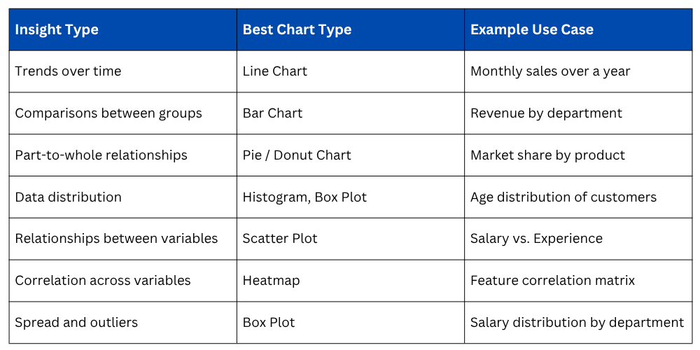 Different chart types are designed to reveal different kinds of insights. Choosing the right chart for your data and question is just as important as the visualization itself.