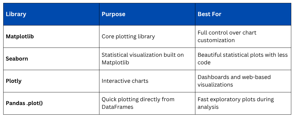 Python offers a rich ecosystem of visualization libraries, each serving a different purpose and level of complexity.