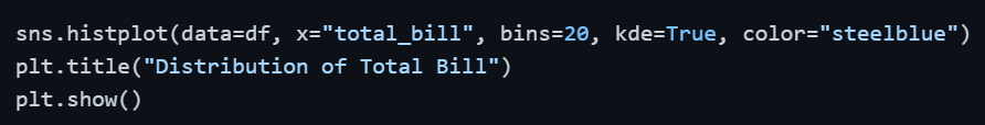 The histplot() function creates a histogram and optionally overlays a KDE (Kernel Density Estimate) curve — a smooth line showing the overall shape of the distribution.