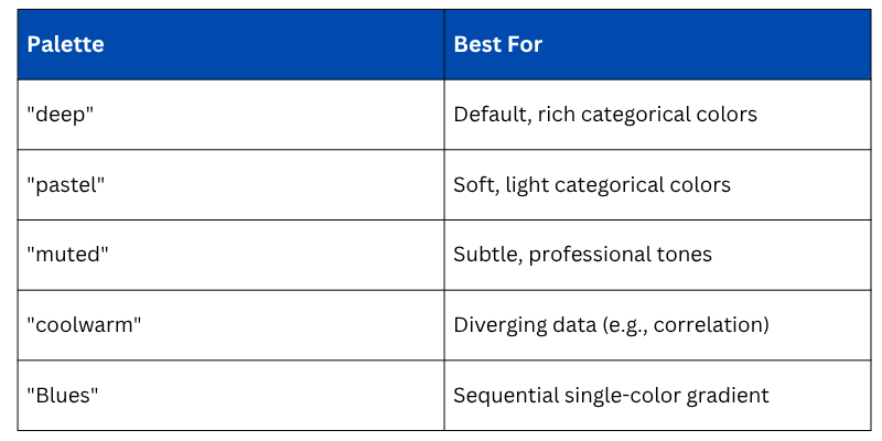 Seaborn's color palettes control how categories and gradients are colored across all chart types. You can apply a palette globally or per plot.